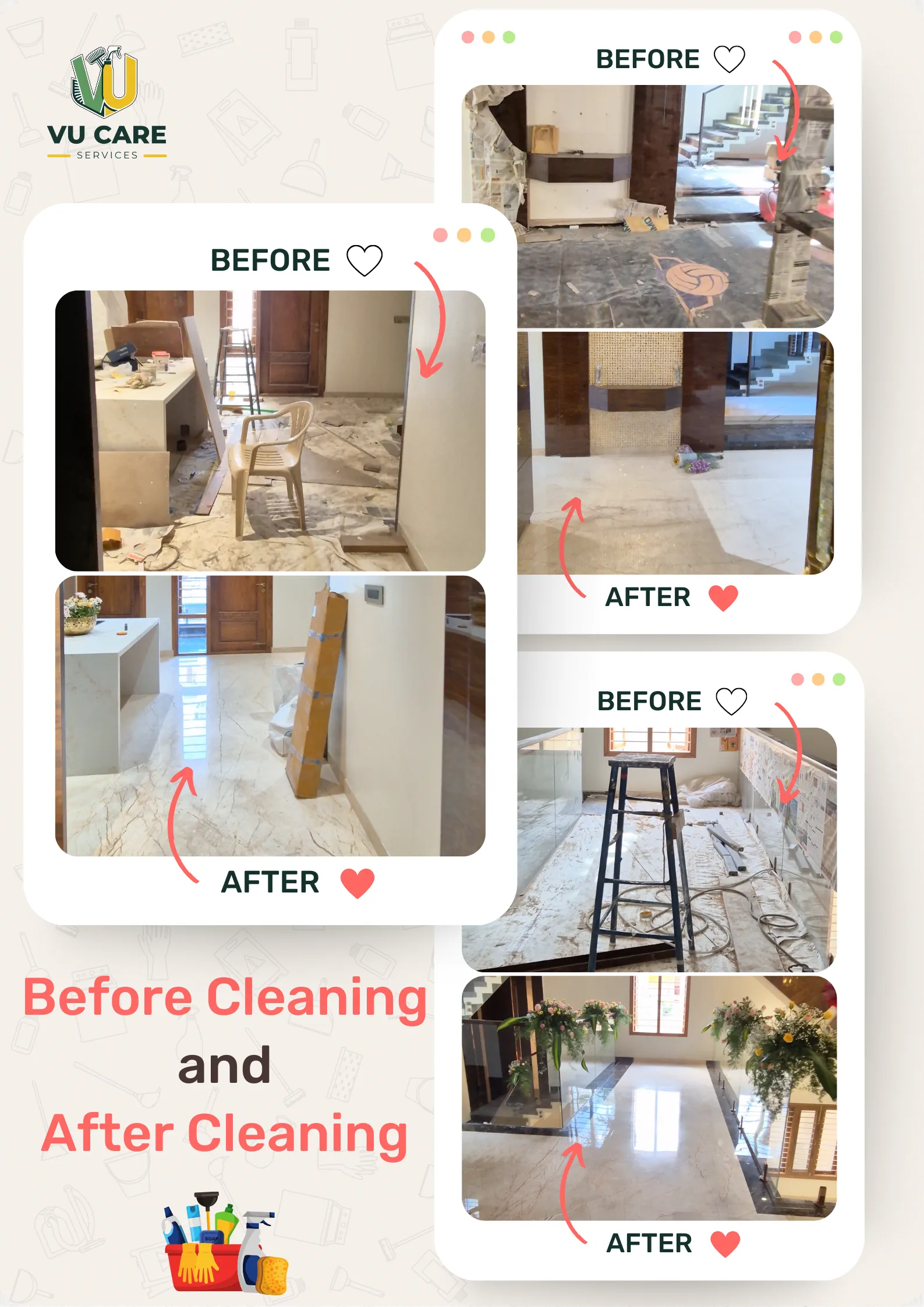 - Floor and Staircase Cleaning : We clean and sanitize all types of floors from marble to wood with professional-grade tools. Often forgotten, staircases are completely cleaned to maintain visual appeal.